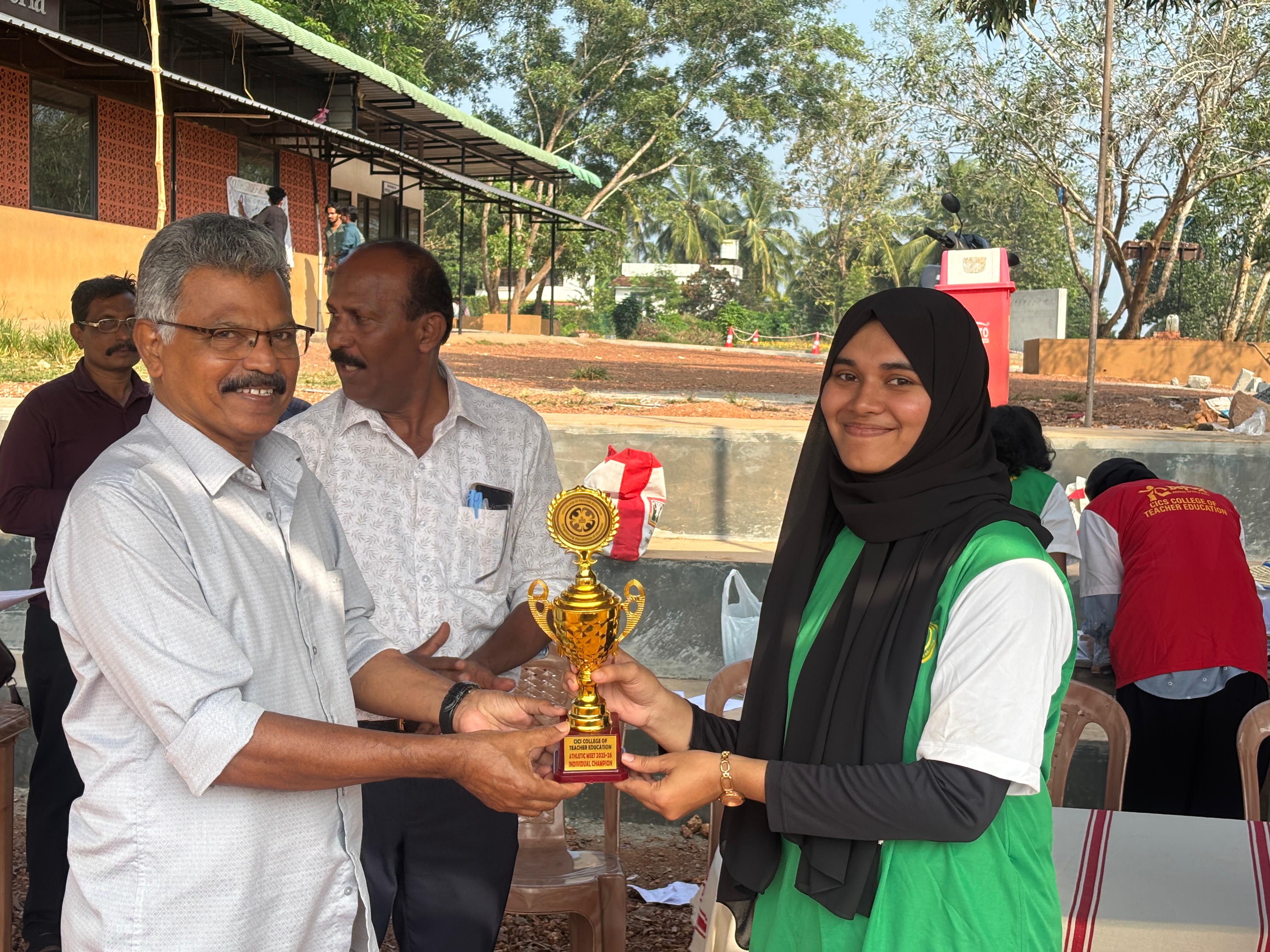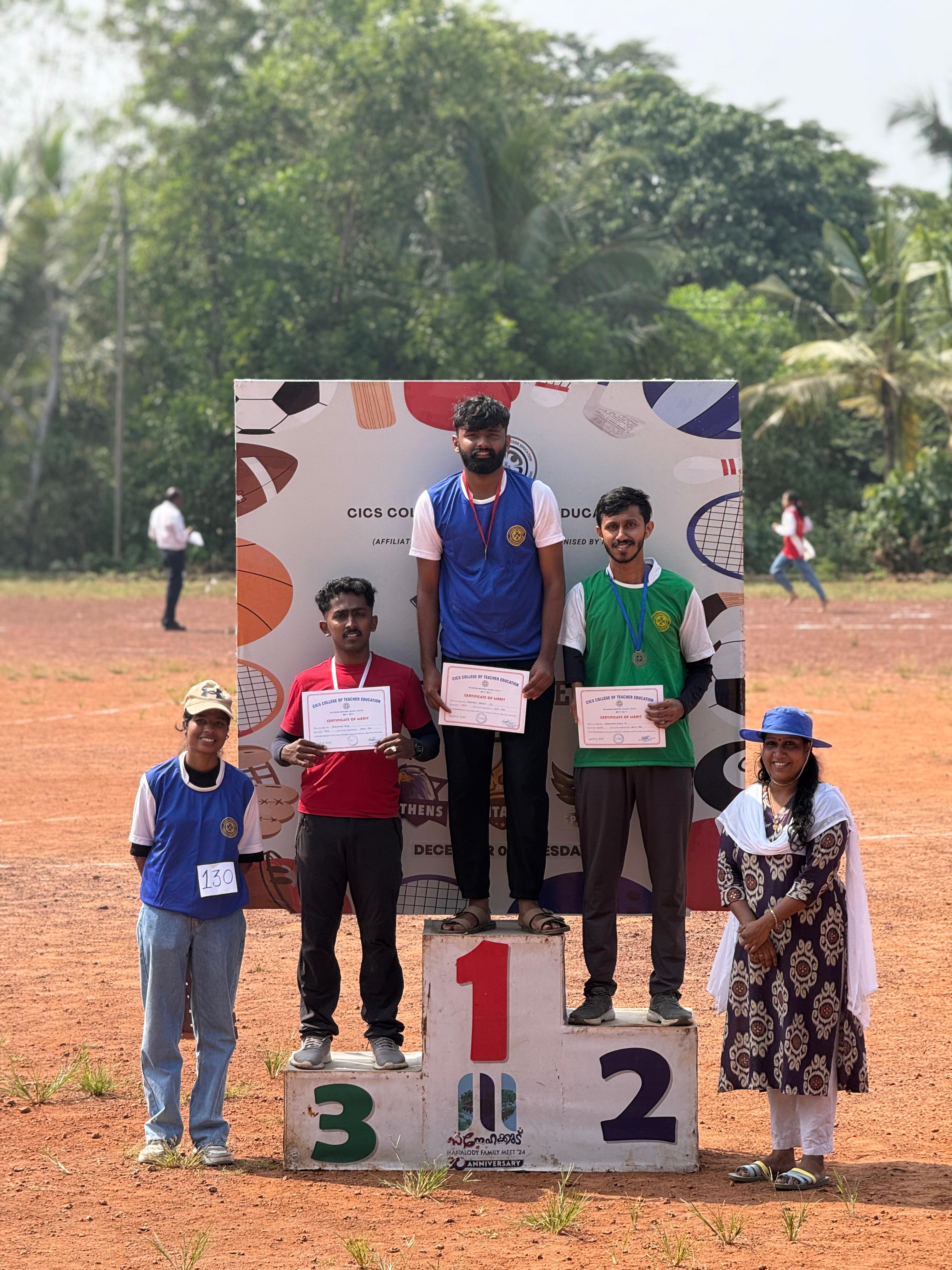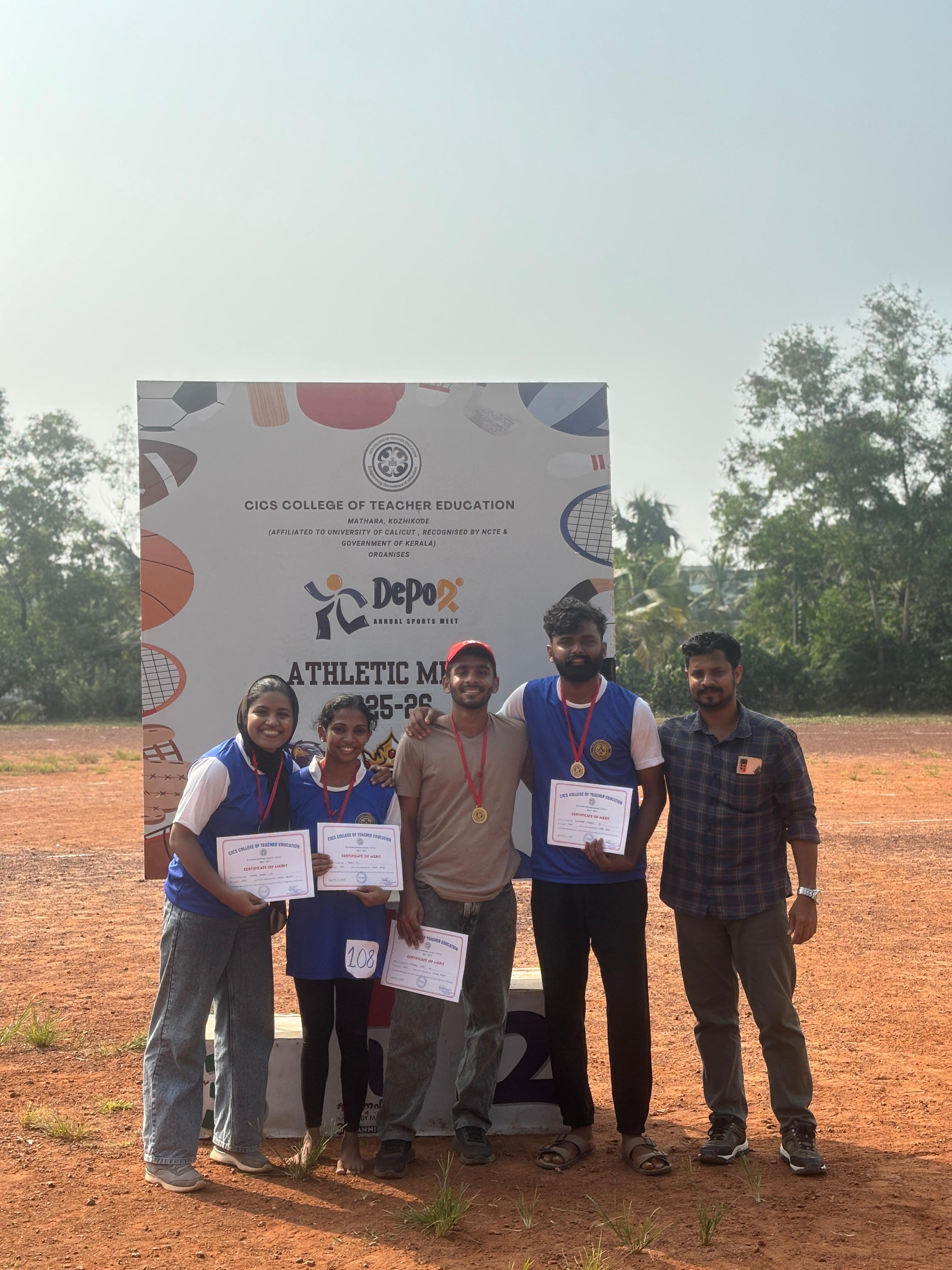 The Annual Athletics Meet 2025–26 of CICS College of Teacher Education was held on December 9, 2025, at the Peekay CICS Arts & Science College Stadium and proved to be a vibrant celebration of energy, talent, and sportsmanship. The event was inaugurated by the esteemed Chief Guest, Devak Bhushan, the 6th Asian U18 Athletics Championships Silver Medalist, whose inspiring address motivated the participants to give their best in every event. Students competed enthusiastically under the three house groups—Athens, Titans, and Spartans—in a total of eight main events that included the 100 m and 200 m races for both men and women, the mixed 4×100 m relay, the 400 m race walk for women, the 600 m race walk for men, discus throw and shot put for both categories, and the highly spirited mixed tug of war. Each event generated immense excitement, with participants showcasing remarkable speed, endurance, and strength while spectators cheered passionately from the stands. The field events displayed exceptional technique and determination, while the relay and tug-of-war events added a sense of teamwork and unity to the day. After a close contest and impressive performances across all events, the house group Athens emerged as the overall champions of the meet, reflecting their consistent excellence throughout the competition. The programme concluded with the distribution of medals and certificates, followed by a vote of thanks, marking the end of a well-organised and memorable sports meet that encouraged discipline, teamwork, and a positive sporting spirit among all students