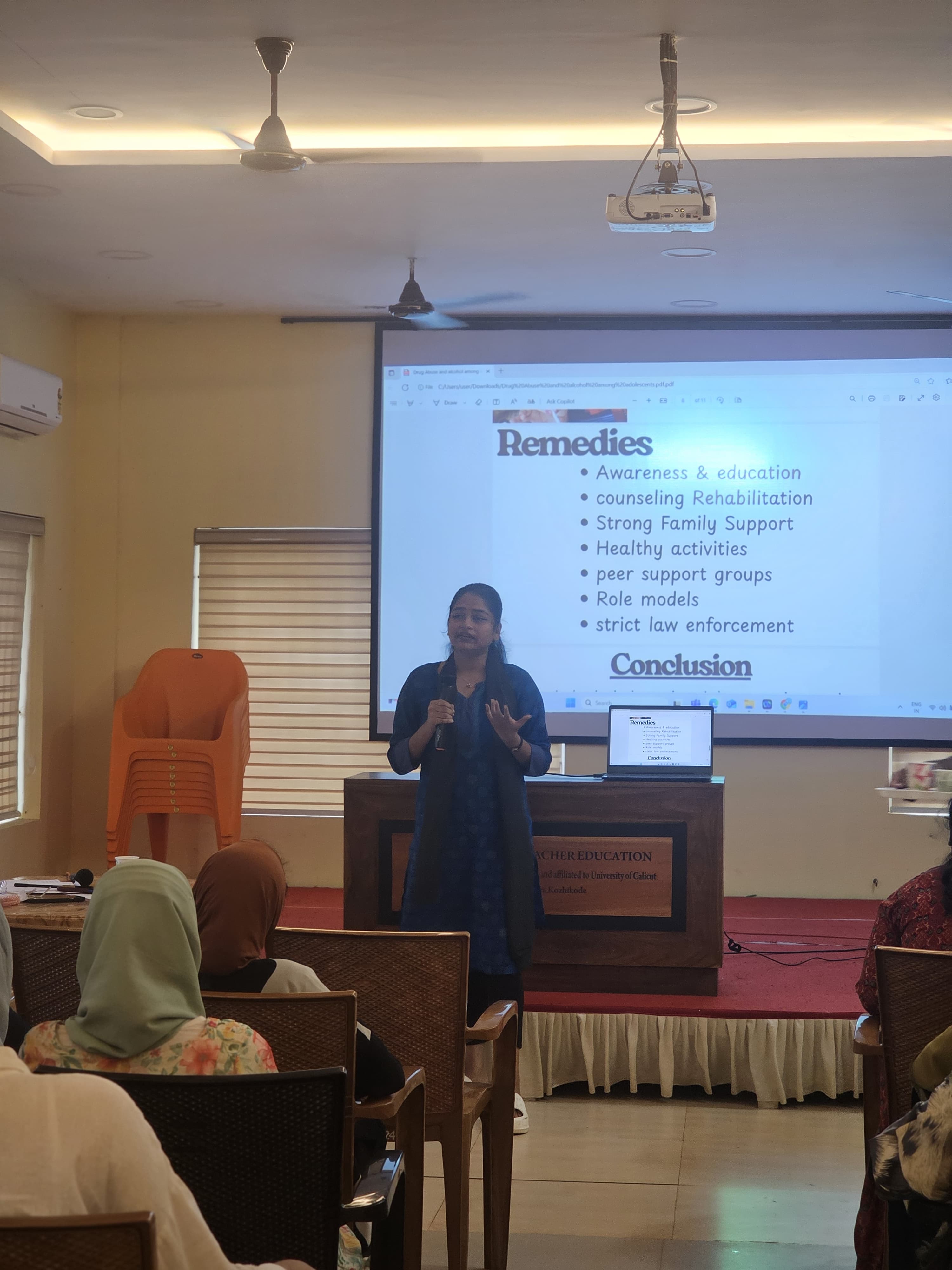 The first presentation was delivered by Aswathy, who spoke on the influence of peer groups on adolescents. She highlighted how friendships and peer interactions play a decisive role in shaping adolescent behavior. While healthy peer relations can promote confidence, teamwork, and social growth, negative peer pressure often leads to harmful practices such as disobedience, risky behavior, and substance use. Her talk underlined the need for adolescents to build strong decision-making skills to resist unhealthy peer influence.